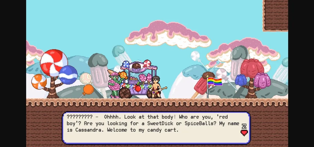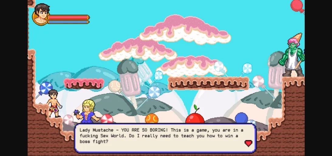 2d game, animated, male protagonist, anal sex, exhibitionism, gay, male domination, adventure, combat, fantasy, humor, monster, platformer, side-scroller