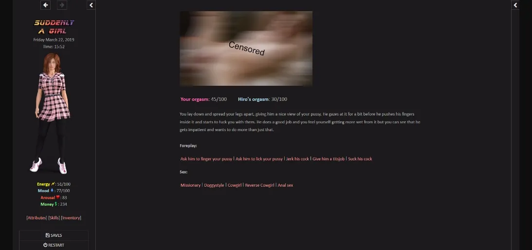Bar first night done. Content with Cheryl, Amanda, Bianca, Marcus. Content that features crossdressing, cum and chastity. Forced and unforced. There’s numerous different branches/variations depending on previous choices and choices on the night. You can even get a hj