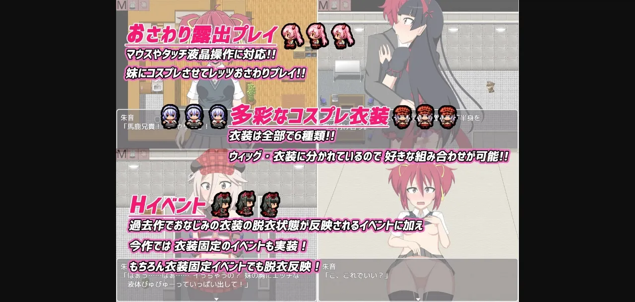 2DCG, 2D game, Female protagonist, Male Protagonist, Japanese game, Censored, Vaginal sex, Oral sex, Group sex, Cosplay, Exhibitionism, NTR(avoidable)