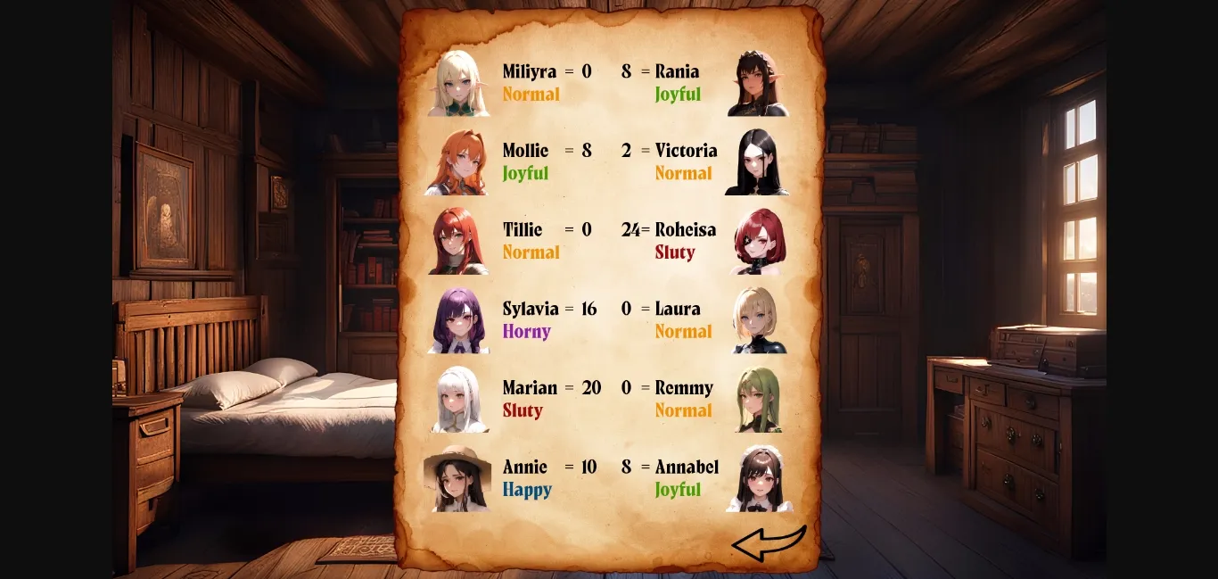-Added a table where you can see the characters’ mood and relationship values.
