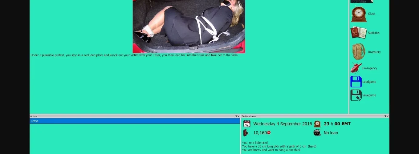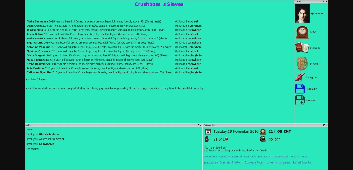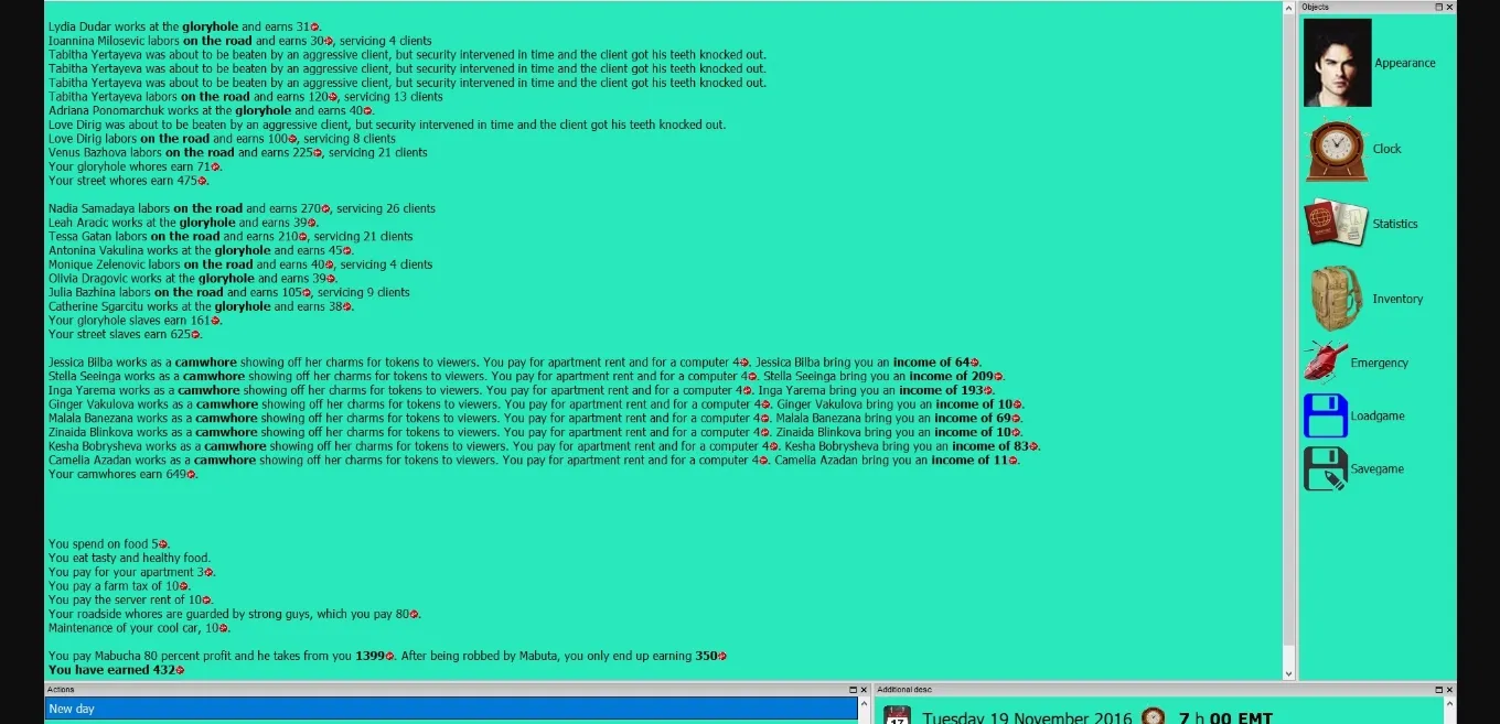 You create a male character and start life in the capital. The action takes place in a parallel world where most things are similar to our world, but there are also differences. In the course of the game you can, for example, create your own gang, you can use and sell drugs, you can own a brothel and manage whores, engage in blackmail and, through acquaintances with the elite, turn things around, you can kidnap people and force them to sign slave contracts. Slavery is legal (with restrictions) and you can train your own slaves. The game has a wide range of actions and a deep sex system.