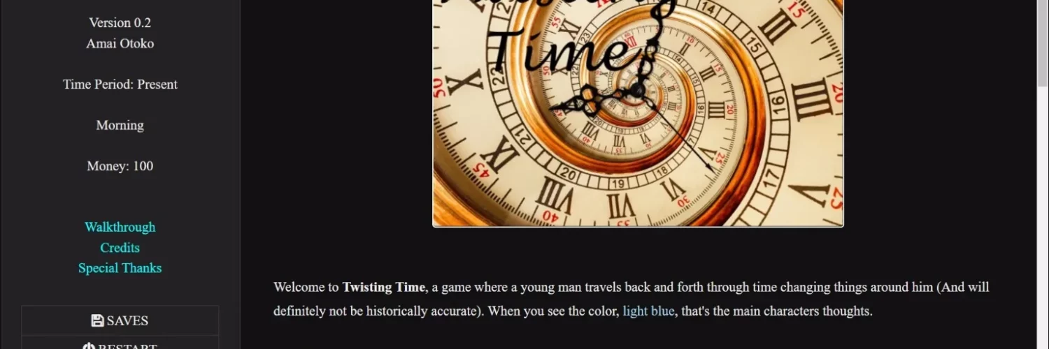 Thank you for trying out my first game/story. I hope you found it enjoyable. I’m an amateur writer and coder. English is my native language, I just suck at it. Criticisms are welcomed, please try to be constructive with it. This will help me to improve the quality of the game/story. Thanks again.