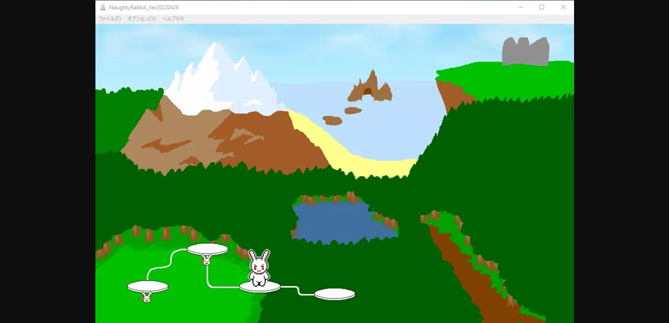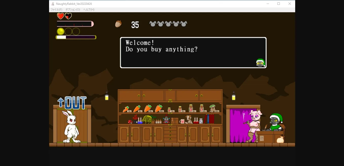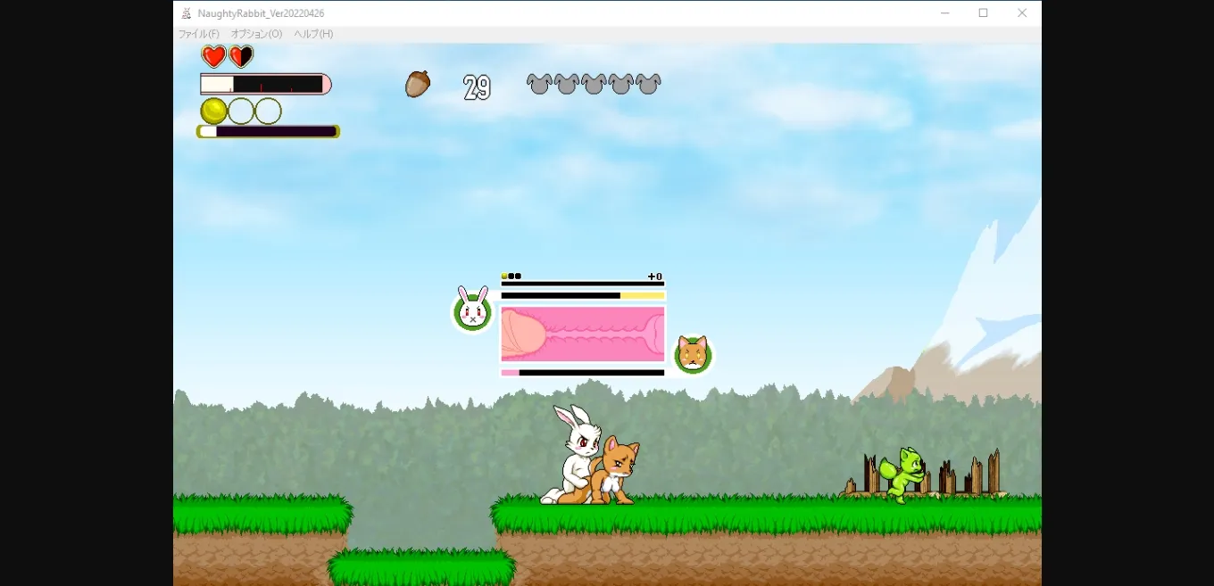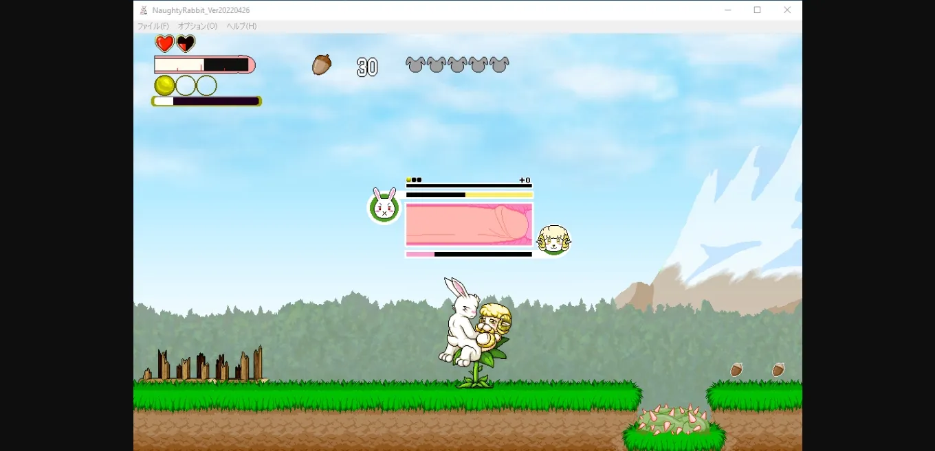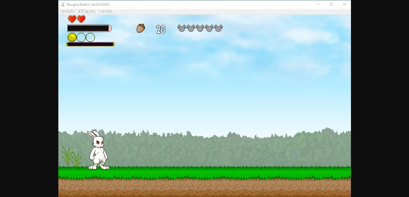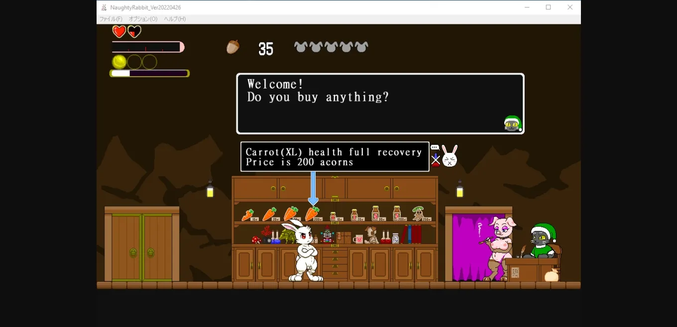 Naughty Rabbit is a 2D side-scrolling platformer action game with the player as a male anthromorphic rabbit and the goal of rescuing the female rabbit captives in each stage. In the current demo, there are three stages with the third stage being a boss stage against a wolf lady. The player can collects the acorns in each stage and use them in the store to buy items such as carrots (restores health) and a mandrake that will restore all hearts if the player loses them all during a stage. After defeating an enemy capable of sex, the player can interact with them by standing next to and pressing button 3 (C key). The sex scenes are animated and involves timing with the goal of either the enemy orgasms first or both partners orgasm together. If the enemy is not satisfied enough, the player will lose a 1/4 part of heart. The game can be played with either a gamepad or keyboard.