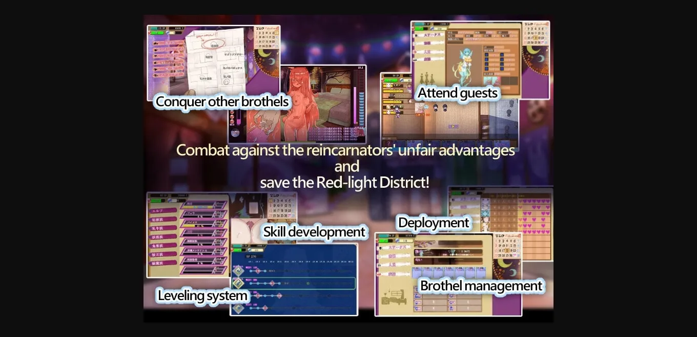 The goal of the game is to unify all the brothels and manage a better business than the competing reincarnator’s brothel with cheat-like otherworld knowledge.