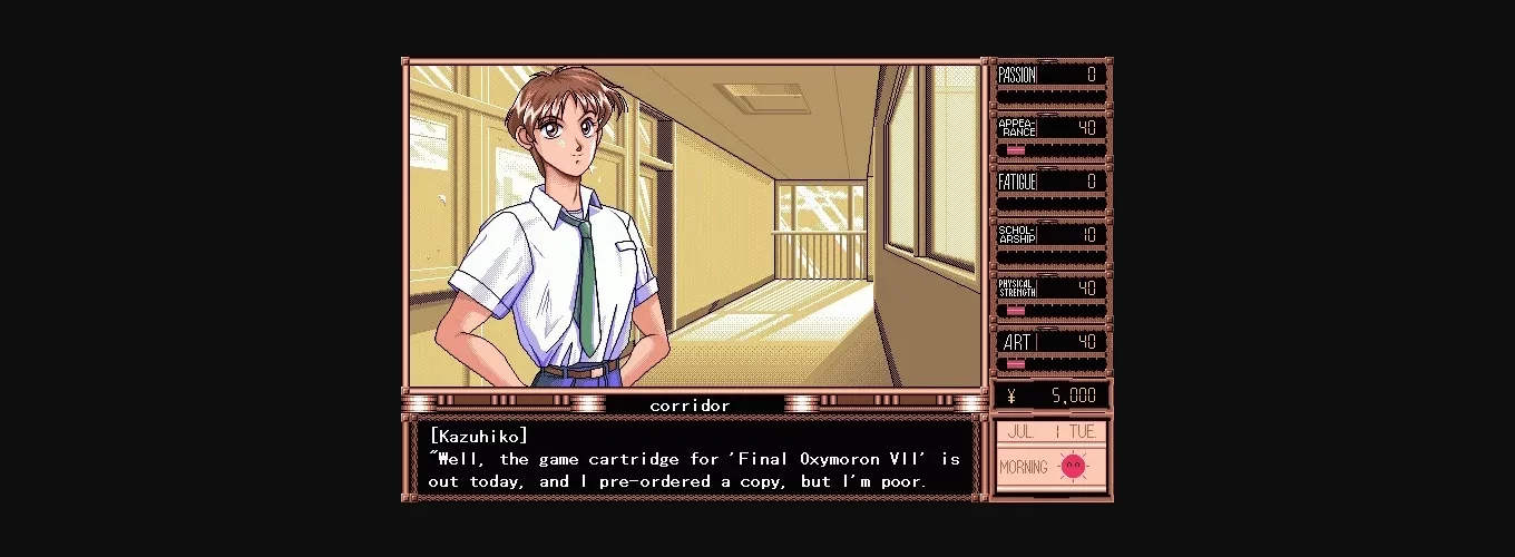 True Love’s genre is considered to be a mixture of a dating sim and visual novel. The player controls a college student looking for his true love. The goal of the game is to win the girls’ hearts before the last summer of freedom is over. Every day, when the main character wakes up, the player can plan the schedule for morning, afternoon, and evening. The choices (such as pleasure, sports, study, etc.) determine what events will occur during the day (if any), and also raise the character’s skills in the selected category. Different girls in the game (there are ten of them) have different interests, goals, and preferences. If the character’s skills in the category that the girl finds most important are high enough, he has a chance to become her boyfriend and the player is rewarded with erotic images of the girl.