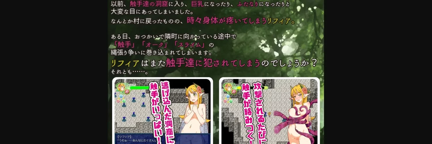 Buxom elven daughter Lyfia entered a cave in the forest and was transformed. Somehow, she escaped and returned to her village, but her body ached strangely. One day on a walk to the next town Lyfia stumbled into a battle of monsters. She took shelter in yet another cave. Unfortunately, no sooner had she entered than the entrance collapsed. She was trapped. Dread and excitement made her heart thump. What would she encounter this time…?