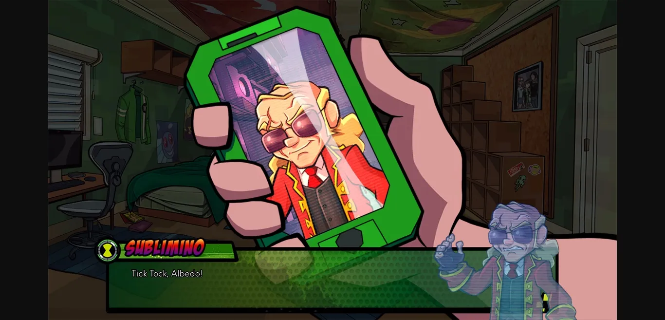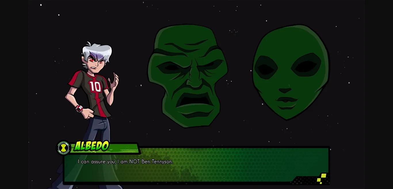 The action starts straight from one of the series’ episodes, on which Albedo has been double-crossed by the villain Vilgax and stolen Ben Tennyson’s DNA-altering alien device -the Omnitrix- from him. Transforming into the mighty Ultimate Humongosaur with his own superior device -the Ultimatrix-, Albedo fights his former ally, but gets overwhelmed and -in the show- captured.