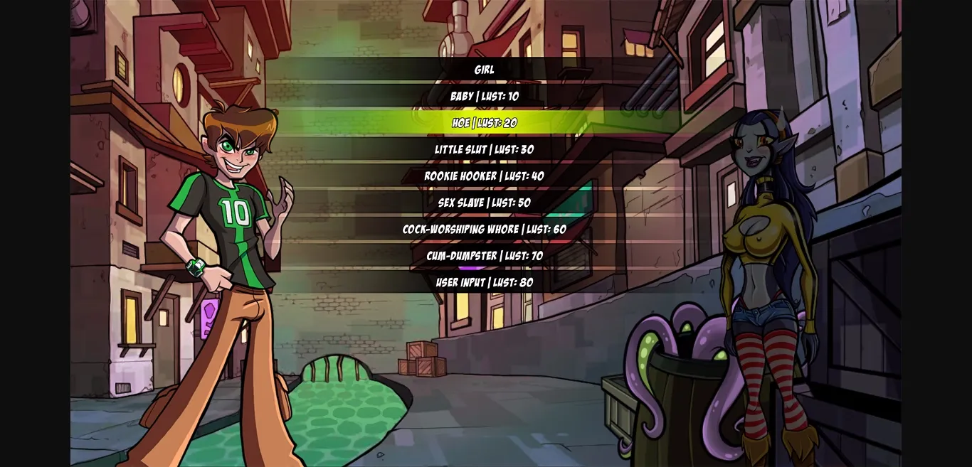 An adult, dark-humored parody based on the Ben 10 franchise! RPG mechanics with turn-based combat, 4 gorgeous main girls to seduce (+ a few surprise appearances!), a HUGE amount of wardrobe customization options, a secret base to build, many locations to visit, a mysterious plot to uncover… probably some more cool shit I’m forgetting: