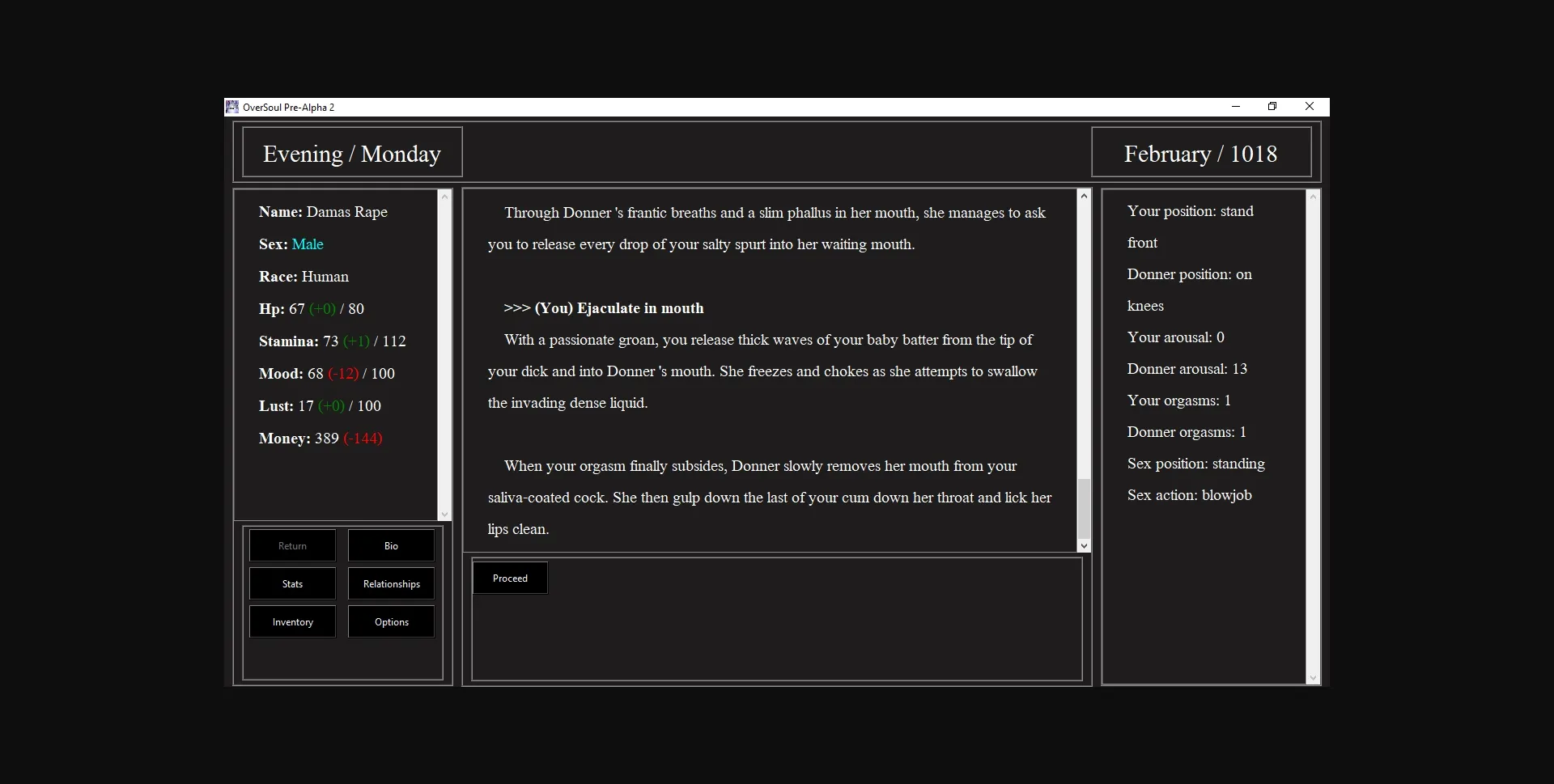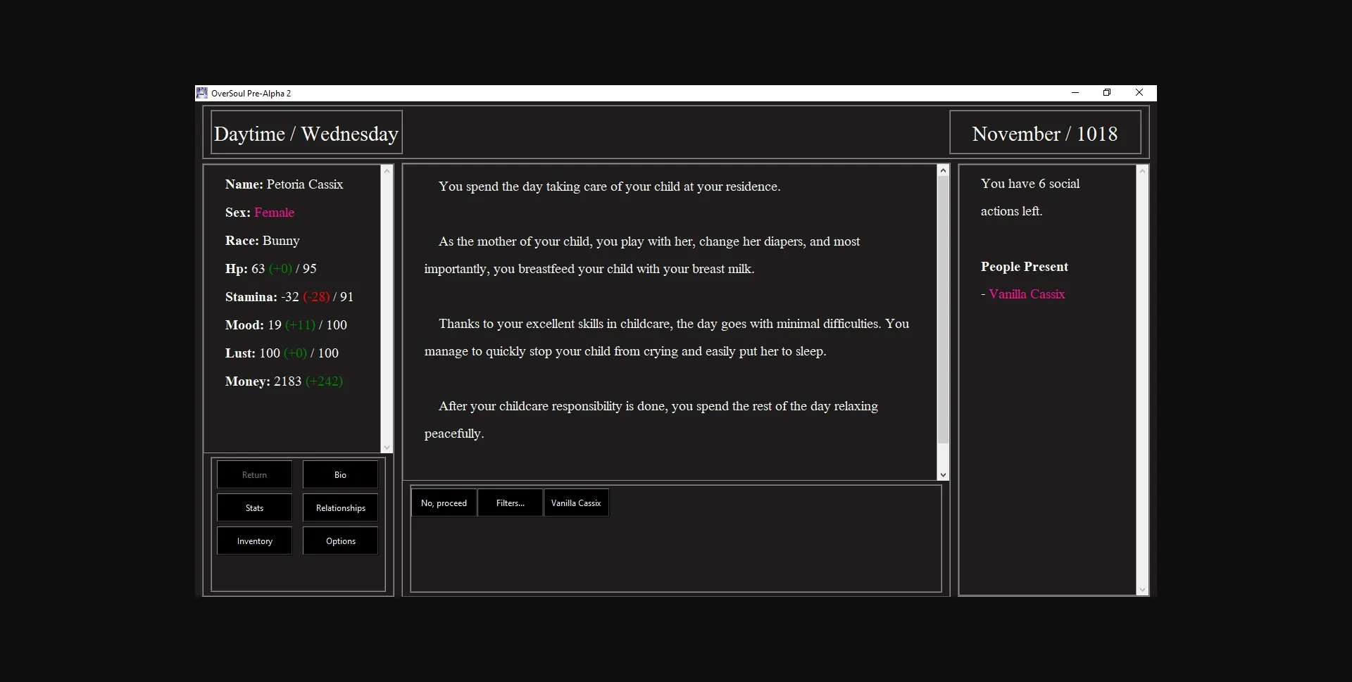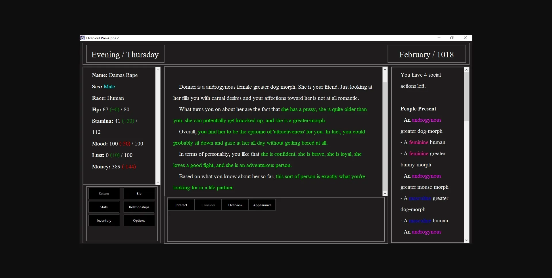 ‘OverSoul’ is a text-based life-sim RPG, where you create your character and live your daily life in a world where anthropomorphic races are the norm. You can perform various activities, get a job, work, earn promotions, build relationships, have sex, get knocked (or knock someone) up, and have children. The NPCs also live their own life, improve their skills, and interact with each other independently from the player.