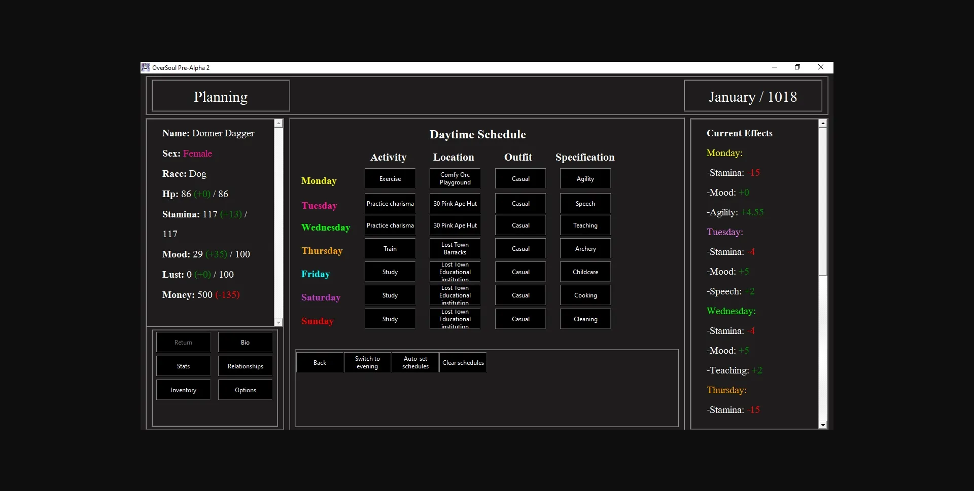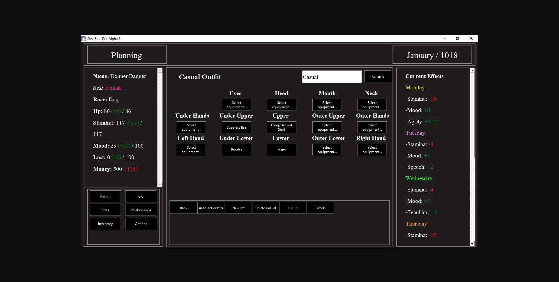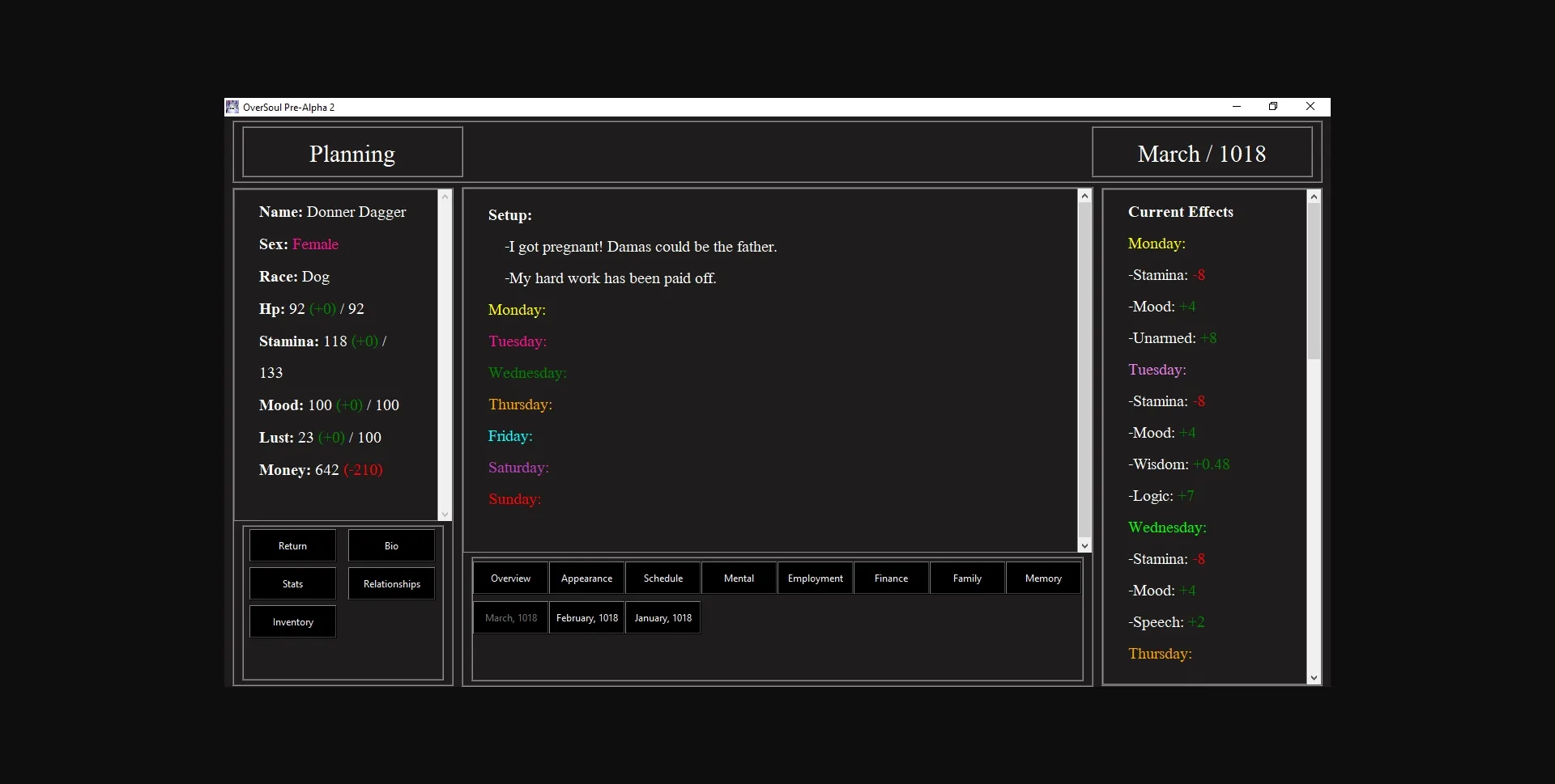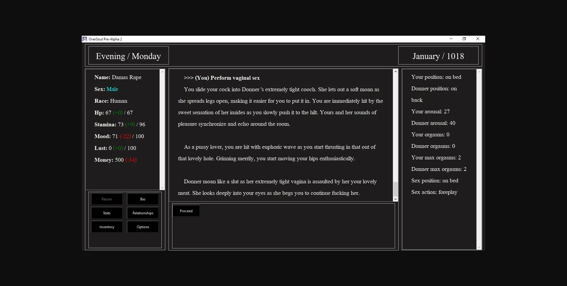 ‘OverSoul’ is a text-based life-sim RPG, where you create your character and live your daily life in a world where anthropomorphic races are the norm. You can perform various activities, get a job, work, earn promotions, build relationships, have sex, get knocked (or knock someone) up, and have children. The NPCs also live their own life, improve their skills, and interact with each other independently from the player.
