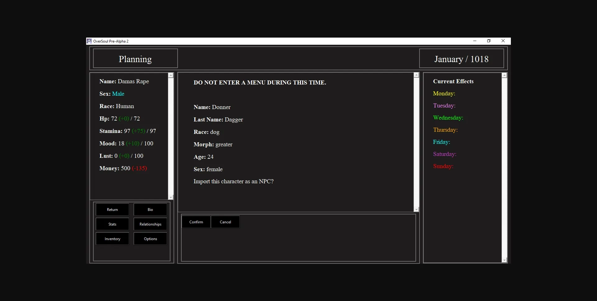 If you encounter a bug, try going into any menu such as Bio, then ‘Return’ and see if that fixes it. Then please take a screenshot of the console and send it to me, as this will help me pinpoint the issue faster.
