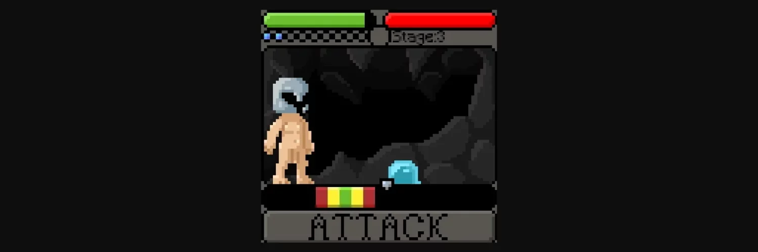 Click the ATTACK button when the pointer is frozen to make it start moving. When the pointer is over the sweet spot, click the ATTACK button to attack. When the pointer is on the green section, you will heal yourself, while doing the most damage. When the pointer hits the edges of the bar, or you attack while the pointer is on black, the enemy will hit you. If you are defeated or defeat a boss, you will move to the sex screen.