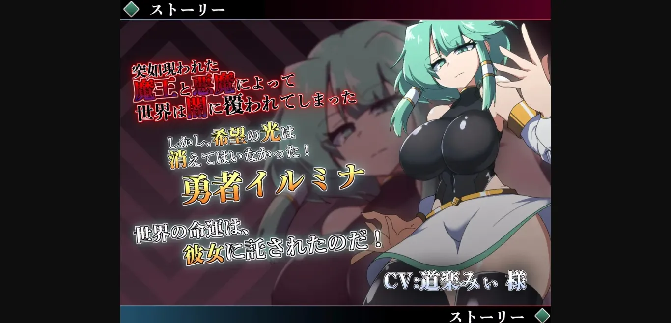 People lived in fear, clinging to the fragile protection of the World Tree that remained. Yet, hope had not been extinguished! The hero Lumina, she is the one who has appeared to save the world! The fate of the world rests upon her shoulders!! ※The anticipated playtime for this game is about 1 to 3 hours. The game’s difficulty level is set very low. This work contains no erotic scenes other than those involving the protagonist, Lumina.