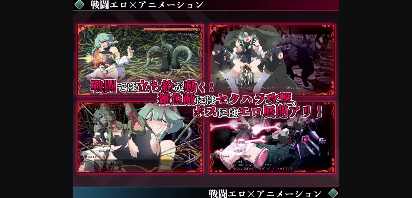 2D Game, 2DCG, Animated, Japanese Game, Female Protagonist, Multiple Endings, Voiced, Anal Sex, Ahegao, Bdsm, Big Ass, Big Tits, Bukkake, Corruption, Creampie, Group sex, Groping, Lactation, Male Domination, Multiple Penetration, Oral Sex, Rape, Spanking, Tentacles, Teasing, Urination, Adventure, Fantasy, Mind control, Monster, Turn based combat,