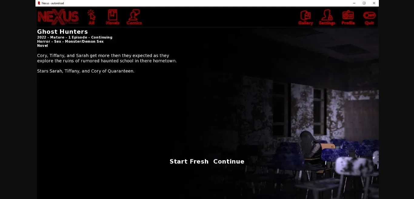 Ghost Hunters – Ghost Hunters is a short kinetic novel told via hand held camera’s, so the entire story is through the POV of cameras (Think found footage). 3 teens decide to explore a haunted school in there hometown and get more then they expected. This story does feature Monsters/Demons, and ghosts, and being an adult story, you can see where that’s going. Currently 1 male demon and 1 female ghost is present in the first episode. More to come in later episodes