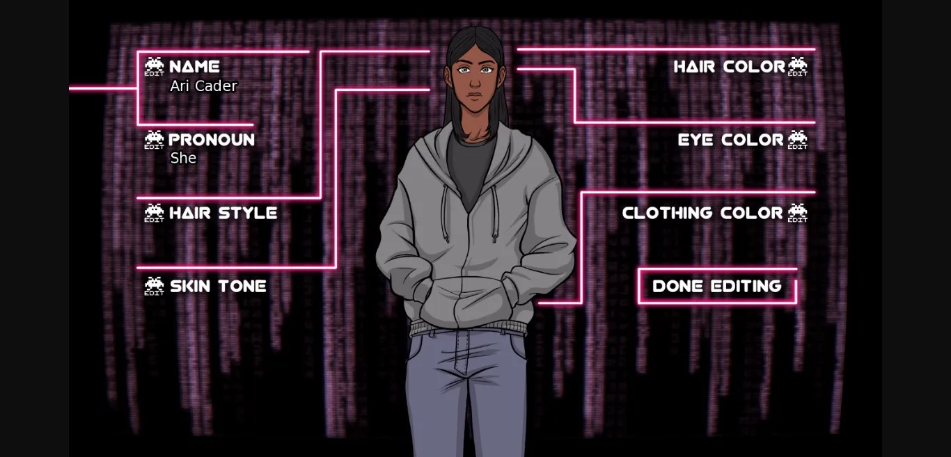- Design your own character from the ground up – pronoun, hairstyle, skin tone, hair color, eye color and more are completely customizable and are reflected throughout the game in both gameplay and artwork!
