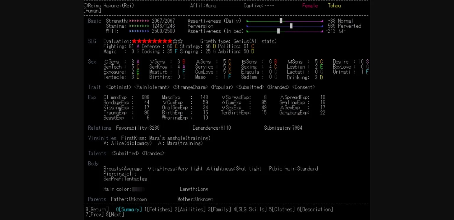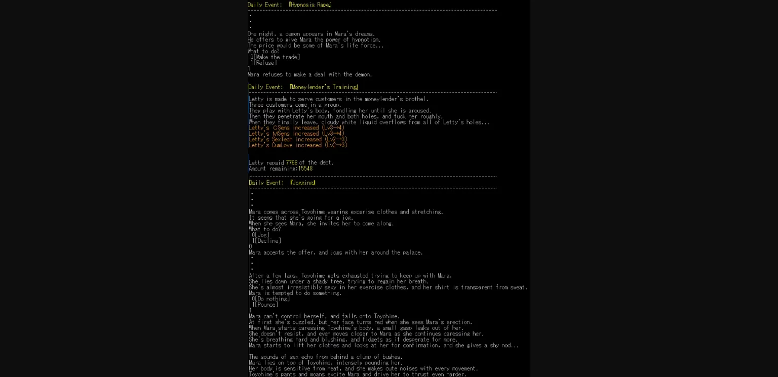 Text based, Simulator, Dating sim, Character creation, Anal sex, Gay, Lesbian, Titfuck, Group sex, Combat, Prostitution, Oral sex, Urination, Vaginal sex, Pregnancy, Spanking, Strategy, Corruption, Japanese game, Multiple penetration