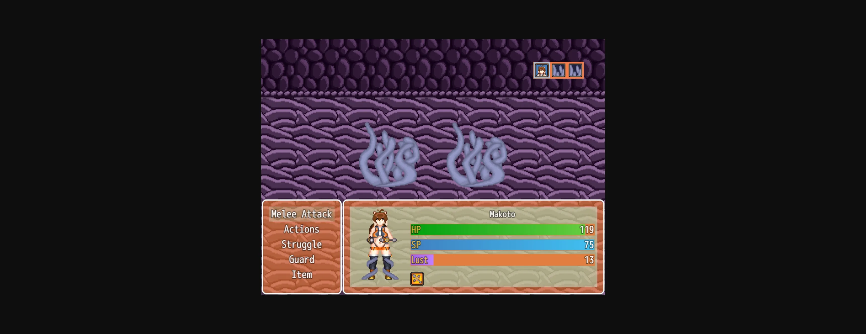 The game is a RPG Maker MV game, so the combat is turn based, with enemies attempting to restrain Makoto enough to allow them to have some fun with her. The leveling system of the game is similar to my previous game, Agents of P.O.R.N., in that as the characters level up, only their HP and SP stats may increase, or they may learn new abilities. The other stats are increased through the equipping of gems, as well as some rare hidden weapons for Makoto to use.