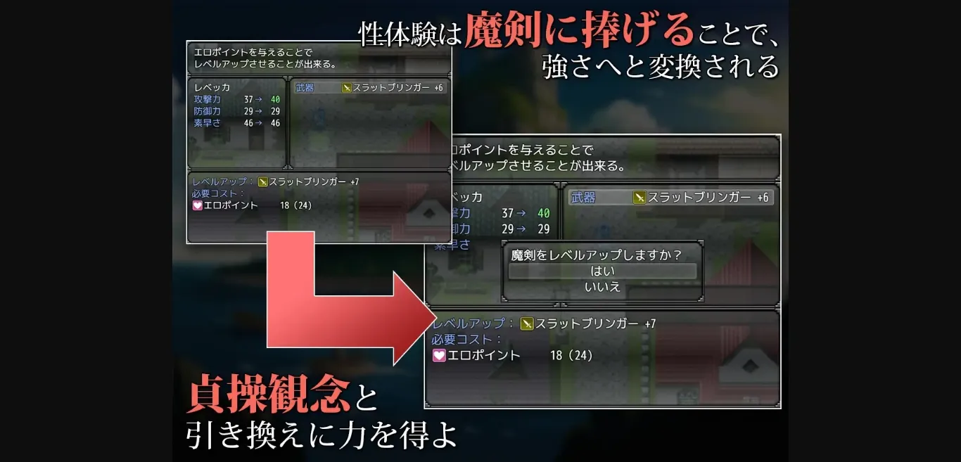 With the cursed sword "Slutbringer," obtained in the new continent, her fate takes a dramatic turn. This magical sword converts the owner’s sexual experiences into energy, gradually enhancing Rebecca’s powers in exchange for her chastity.