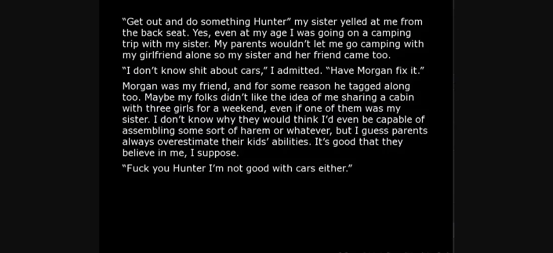 The protagonist is on a camping trip with his girlfriend, friend, sister, and sister’s friend when their van breaks down in the middle of the woods. They come across a mysterious mansion and go inside looking for help or at least a phone. Instead the protagonist ends up turning into a girl and lots of sex ensues. Of course.