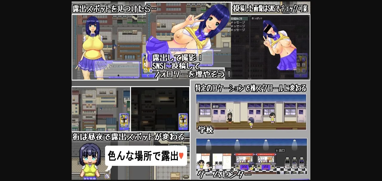 2DCG, 2D game, Japanese game, Censored, Female protagonist, Outdoor exhibition, Peeping, Vaginal sex, Creampie, Titfuck, Oral sex, Teasing,