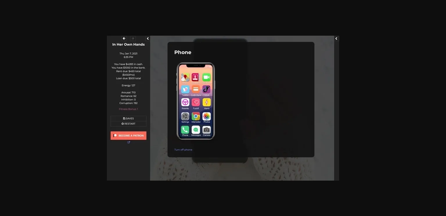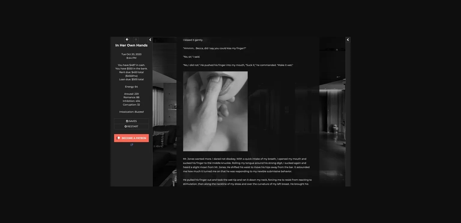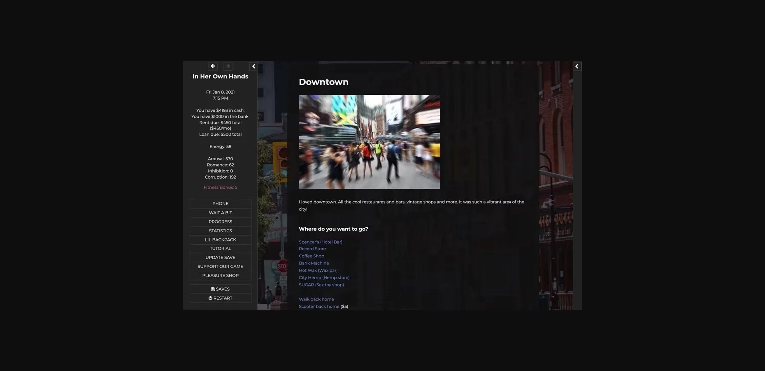 "In Her Own Hands" is a compelling, HTML-based, adult game featuring a young female protagonist and the temptations that await her in the city. This immersive life sim was intentionally created to offer a sex-positive exploration of a woman’s sexual journey. Her erotic adventures know no bounds but are grounded in consent. She retains full agency over her decisions, no matter what consequences might follow. The IHOH story will continue to unfold as you connect with her personality, molding her character and journey according to your own will as you are presented with meaningful choices at every turn.