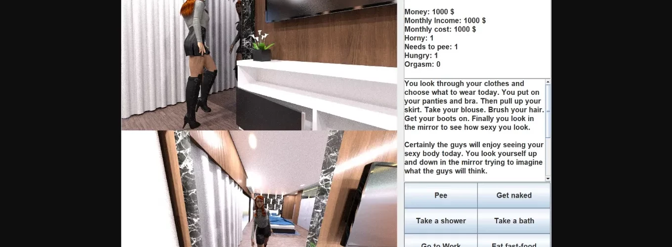 Jenna’s Virtual Life is a Java-based adult simulation game. You play by living the life of the character: a young woman, named Jenna. The simulation is trying to be as open and as realistic as possible. Depending on the location you are in, there are a number of actions available. These actions may be further limited by previously performed actions. However, there is no artificially imposed limitation, thus adding to the realistic nature of the game.