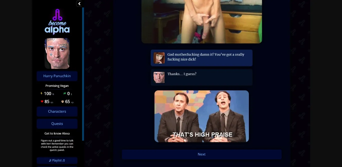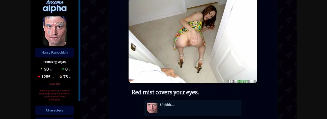 Become Alpha is a porn game with kick ass branching story line, quests, RPG-like experience system, and possibility to have sex with many partners.