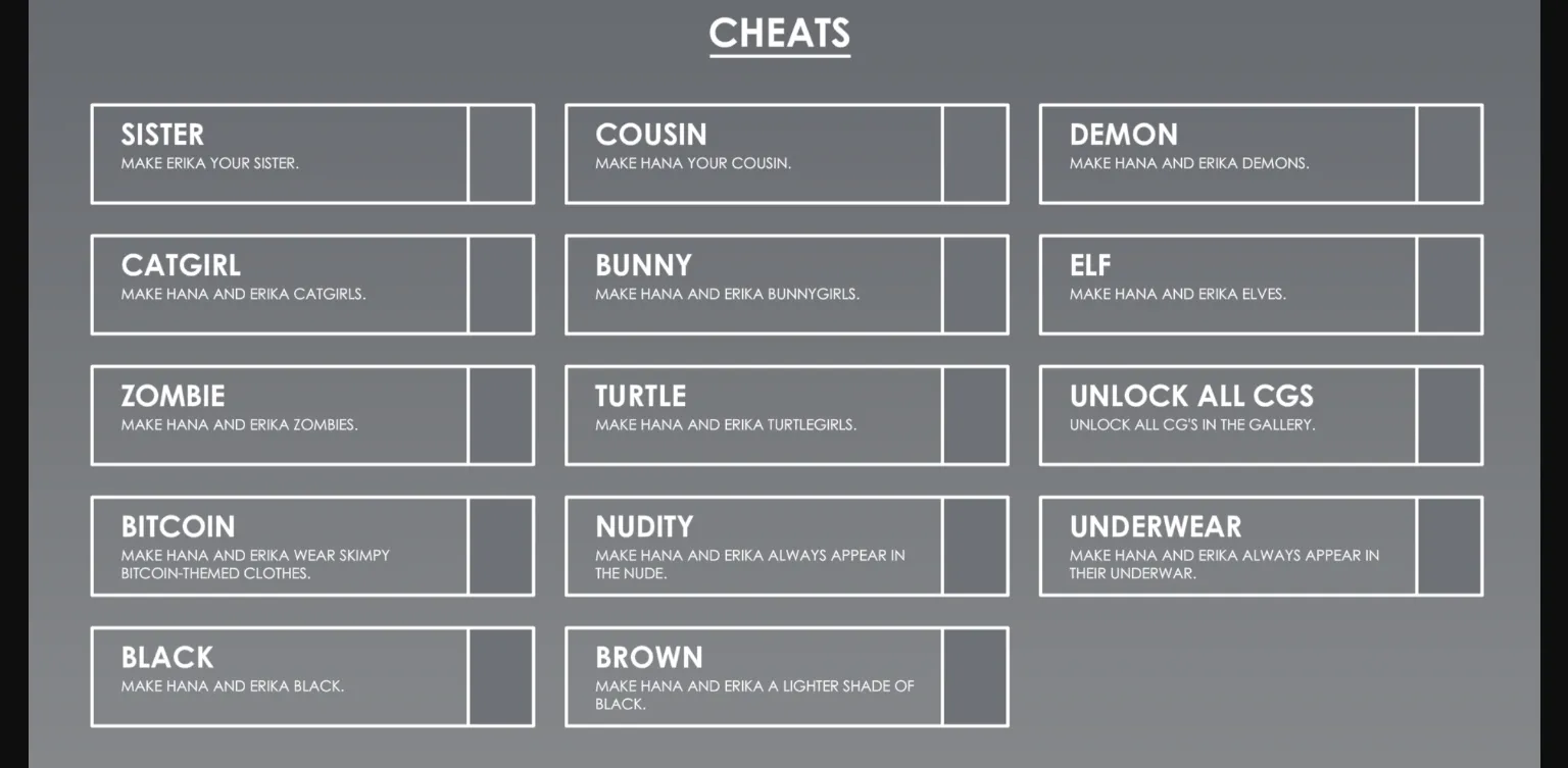 VN, Joke Endings, Ejaculation Choices, Sexual Fantasizing, Only Avoidable Sexual Content, Sounds of Copulation, Cheat Codes, Varying Ending Songs, Author Commentary, Short Sexual Scenes, University Student Protagonist, Only Avoidable Rape Scenes, Heroine with Glasses, Unlockable Sexual Content, Cousin Incest, Changeable Clothes