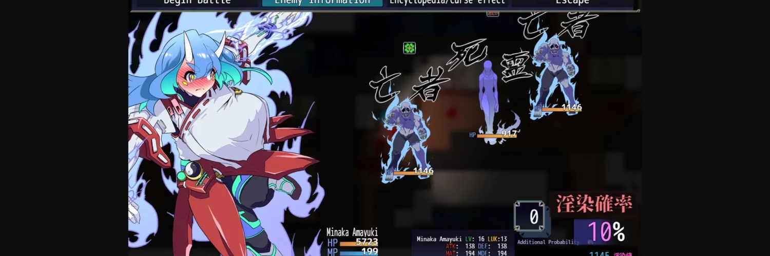 However, Minaka’s body is afflicted by a lewd mark, the Taint of Lust, inflicted upon her by the demon lord, ‘Sitateru’. As Minaka uses the ‘Tsuina no Himitsuho’ to turn her fallen foes into powerful spiritual techniques, the taint within her grows.