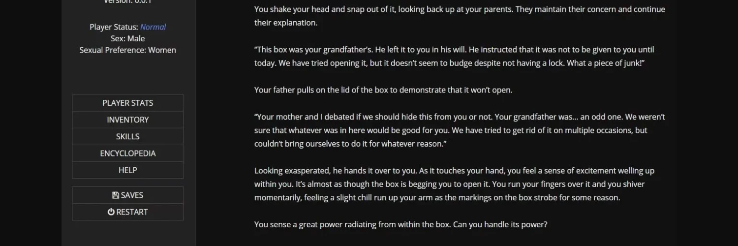 In this interactive novel—inspired by retro text adventures, dark literature, and nukige—you decide which path to follow.
