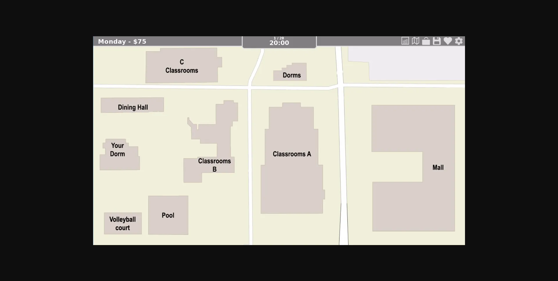 You begin the game with the first day of college. But the focus is not only on meet and fuck, it is about creating a sound future with someone or by yourself. The classes actually contain informations and if you fail to study the game will end prematurely.