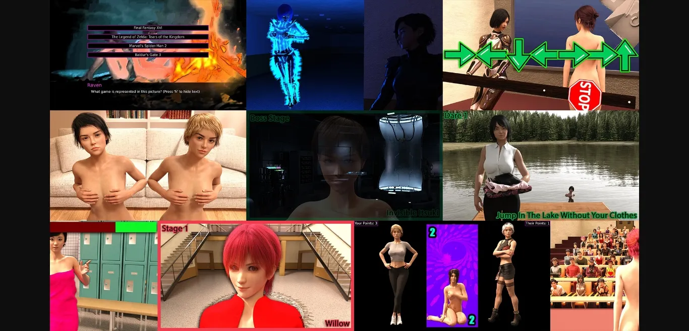 You play as Alice, you’ve been invited to the Raven’s Nest to play Raven’s new trivia game against 6 different opponents. You’ll need to answer questions and play minigames to unlock dare images and epilogues for each character you challenge.
