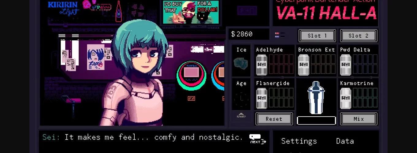 In this world, corporations reign supreme, all human life is infected with nano-machines designed to oppress them, and the terrifying White Knights ensure that everyone obeys the laws. But, this is not about those people. You are a bartender at VA-11 HALL-A, affectionately nicknamed "Valhalla." Although it is just a small bar downtown, it attracts the most fascinating people this side of dystopia. Keep your clients lubricated and you will be made privy to the most interesting stories.