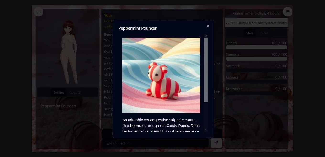 The engine focuses on the bodily transformative aspects of adventure. You can experience changes such as the size of your belly/breasts or the overall fat distribution in your body. You can undergo virtual pregnancy, breast/belly inflation, weight gain, and more. With AI-powered storytelling, each playthrough is unique and tailored to your choices.