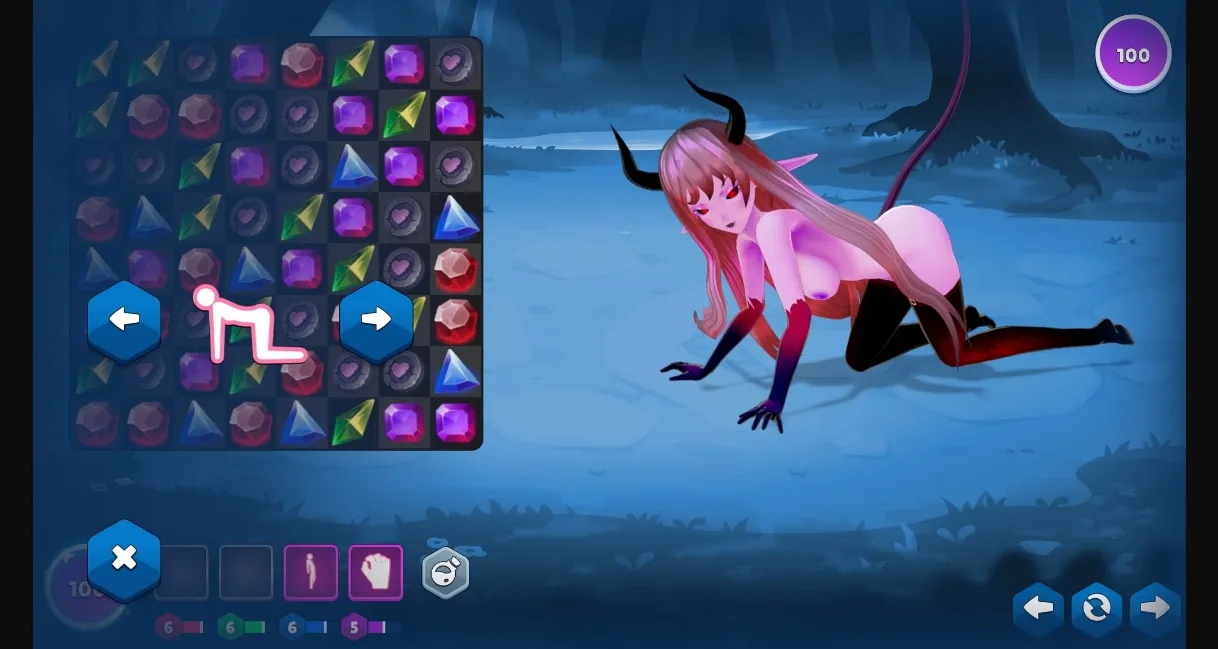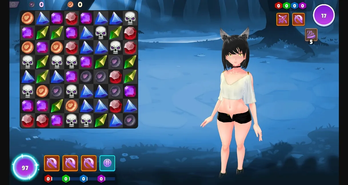 A naughty single player deck builder rogue-like with match-3 puzzle mechanics. Collect cards to make your deck stronger and coins to buy potions and unlock new cards while working your way through matches against cute monsters and anime girls.