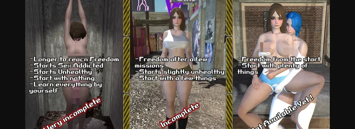 3D Game, Character Creation, Big Ass, Big Tits, Exhibitionism, Groping, Masturbation, Prostitution, Sex Toys, Scat, Slave, Vaginal sex, Anal sex, Combat, Dystopian setting, Sandbox, Simulator, Futa/Trans, Female protagonist, Male protagonist