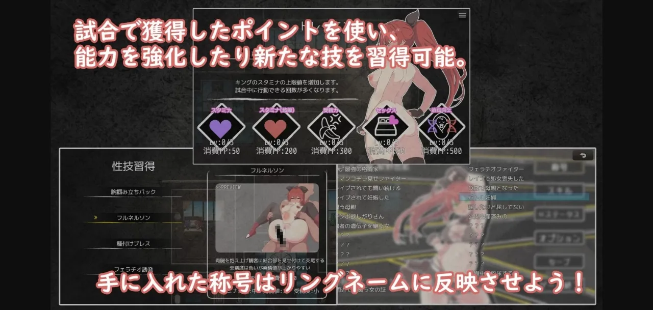 Enhance your heroine with the points you get from the audience by raping her in a match!