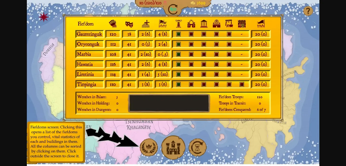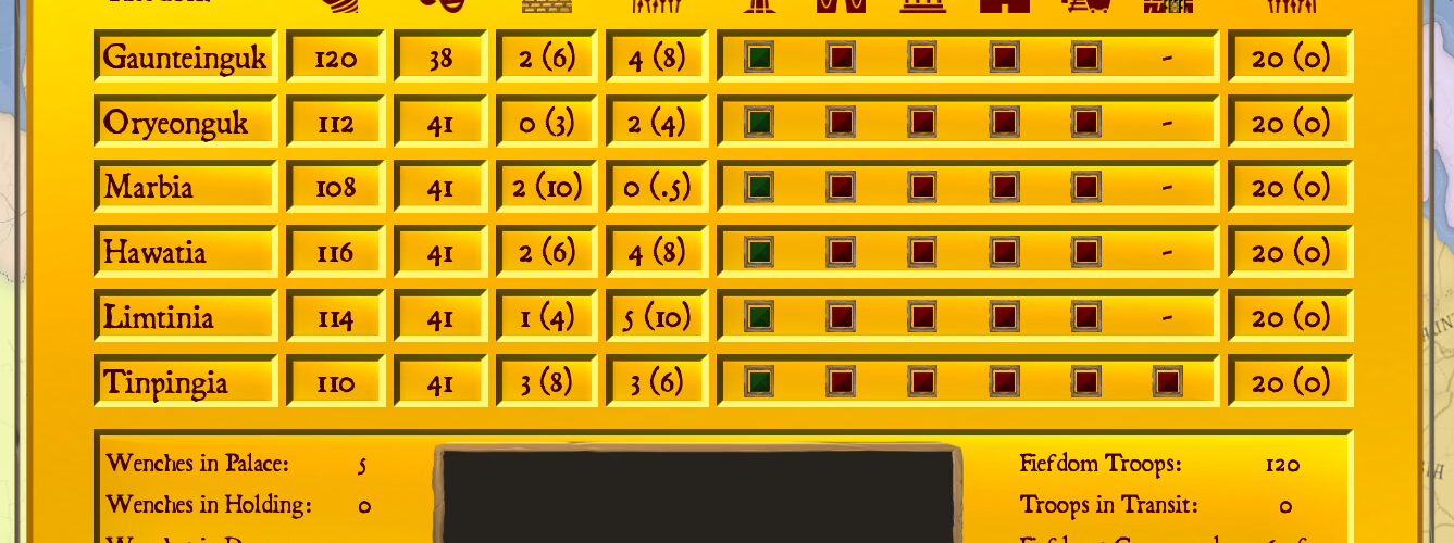 For those of you not sure what Morale does: every turn I roll 1-100 for each fiefdom and compare it to Morale. If it’s lower, the fiefdom Yields gold and/or troops. Higher Morale => higher chance of yield. Using careful placement of Temples and rulers in the palace you can decide what do you wish to recover first, gold or troops.