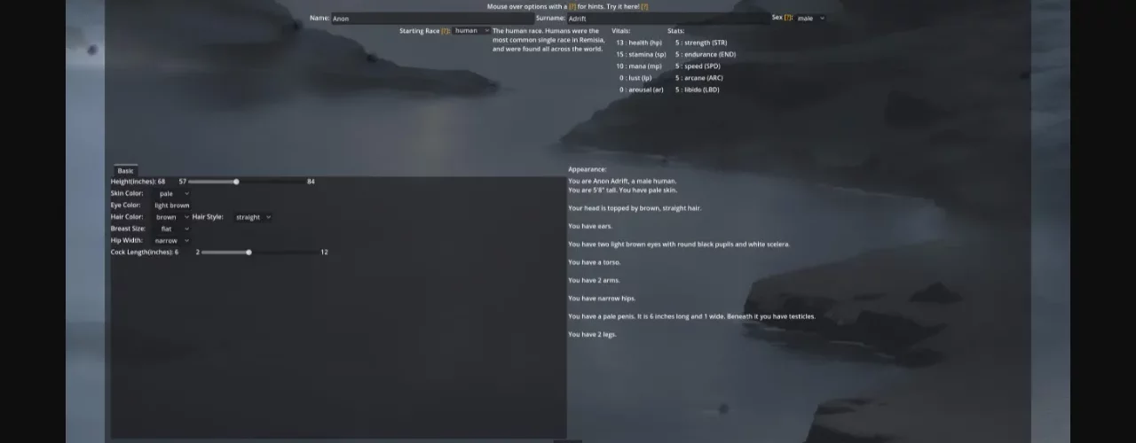 A World Adrift is an adult role-playing game set in a fading world. It is inspired by games such a Corruption of Champions, Lilith’s Throne, and Strive for Power, among others.