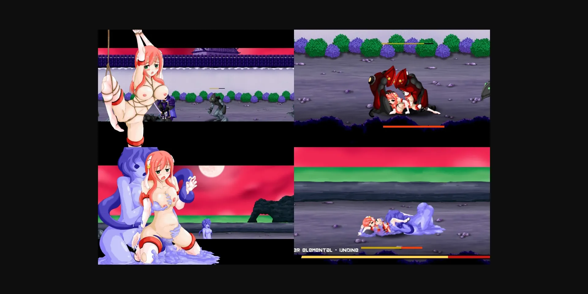 2DCG, 2D game, Female protagonist, Combat, Voiced, Animated, Side-scroller, Adventure, Multiple endings, Cosplay, Lesbian, Monster, Monster girl, Rape, Vaginal sex, Tentacles, Group sex, Oral sex, Groping, Spanking, Japanese game