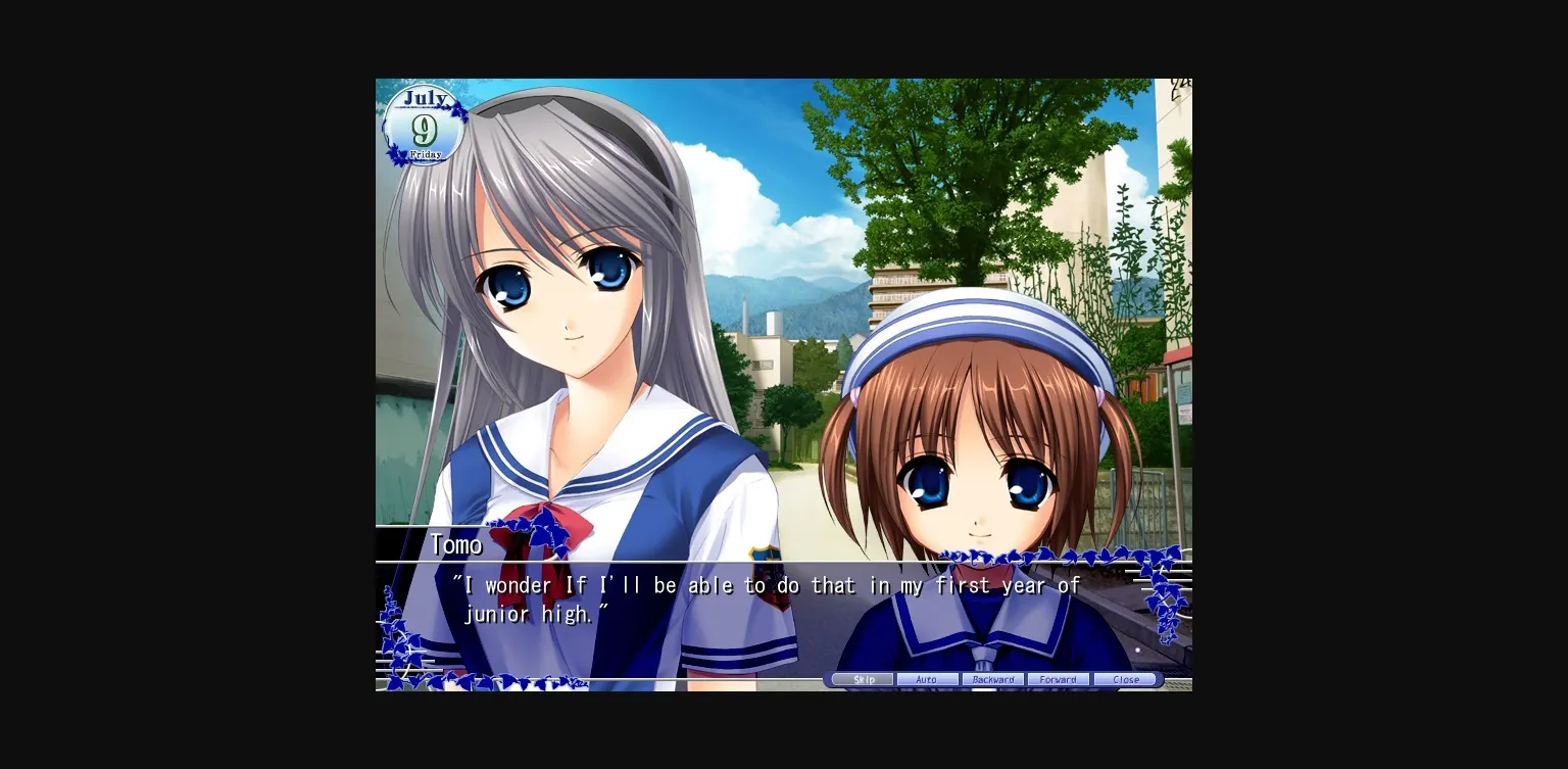 Tomoya, the protagonist, has started to work at a waste collection company in the outskirts of town. He recently begun living on his own, and enjoys a calm and happy life with his girlfriend Tomoyo.