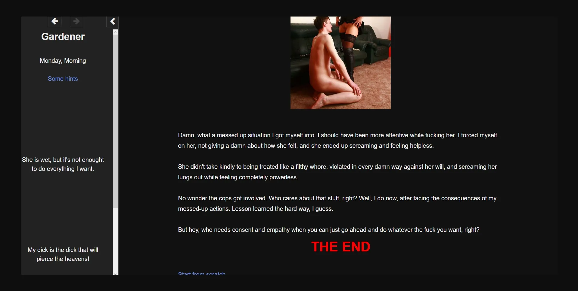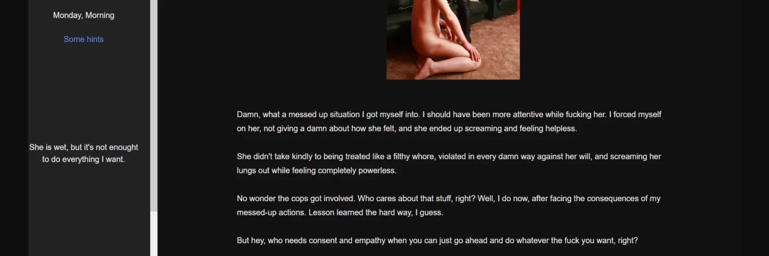 Male Protagonist, Multiple Endings, Real Porn, Text Based, Combat, Anal Sex, Adventure, Sandbox, Romance, Voyeurism, Vaginal sex, Titfuck , Teasing , Spanking, Slave, Sexual Harassment, Rape, Oral Sex, Milf, Male Domination, Humiliation, Groping, Corruption, Gay, Cheating, Group Sex, Multiple Penetration, Pregnancy