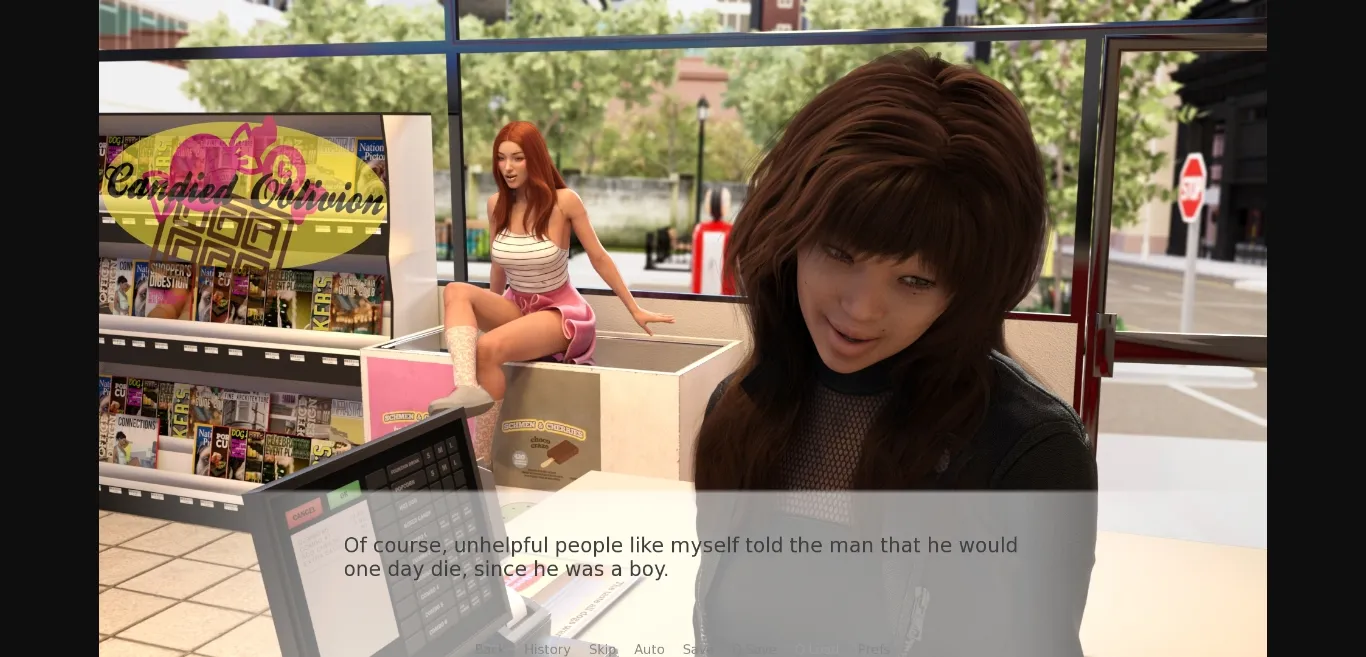 You play as a man in an existential crisis and meet two very special women. An artistic redhead who loves human connection will take you out of your head and gas station. And a spunky firebrand who will take what she wants.