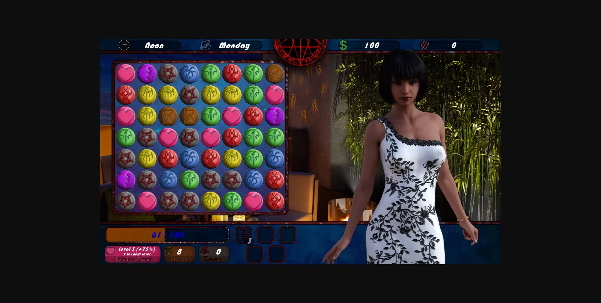 Succubus Contract it’s a puzzle dating sim game involving several other mechanics. For some reason, you contract with the succubus Lilith. You get strength and abilities that make you more attractive to girls. Going out for dates and giving gifts to girls, you will improve your skills.