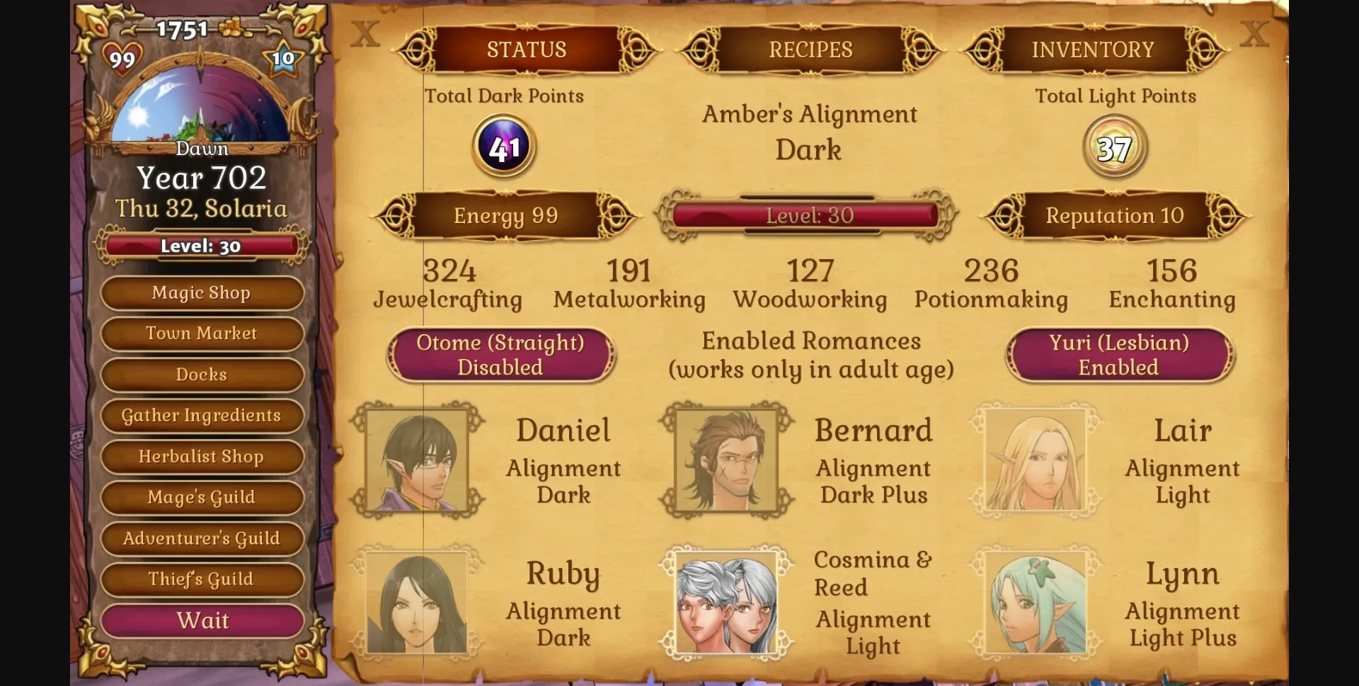 The game can be played as a dating sim and offers an optional crafting/simulation game. Each choice will change Amber’s (and her friends/love interests) alignment: there’s Dark and Light. But be careful: dark and light doesn’t mean wrong or right. There are no right or wrong choices in this game, though some endings are more sad and cruel than others!