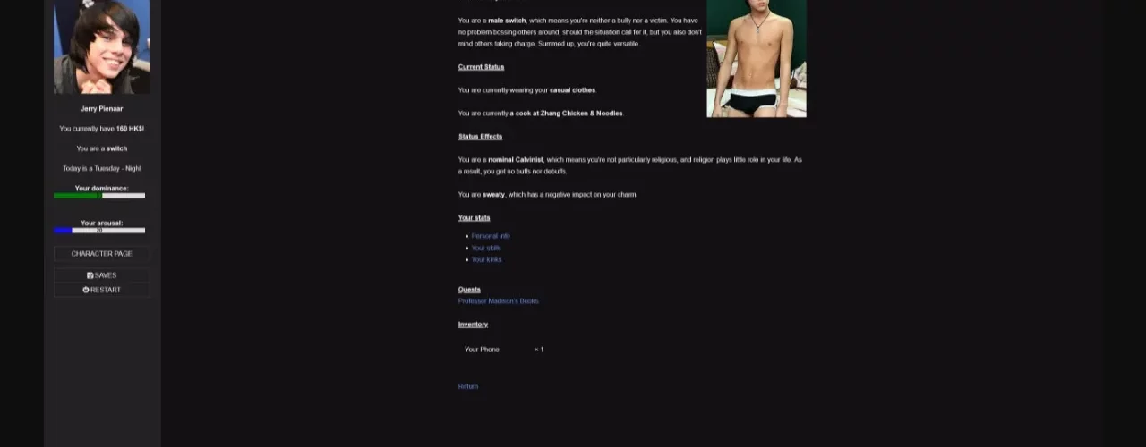 Adventure, Anal sex, Big ass, Big tits, Blackmail, Character creation, Cheating, Corruption, Drugs, Exhibitionism, Female domination, Gay, Humiliation, Incest, Interracial, Male domination, Male protagonist, Management, Masturbation, Milf, Multiple penetration, Netorare, Oral sex, Real porn, School setting, Sex toys, Simulator, Sissification, Slave, Stripping, Swinging, Teasing, Text based, Vaginal sex, Voyeurism