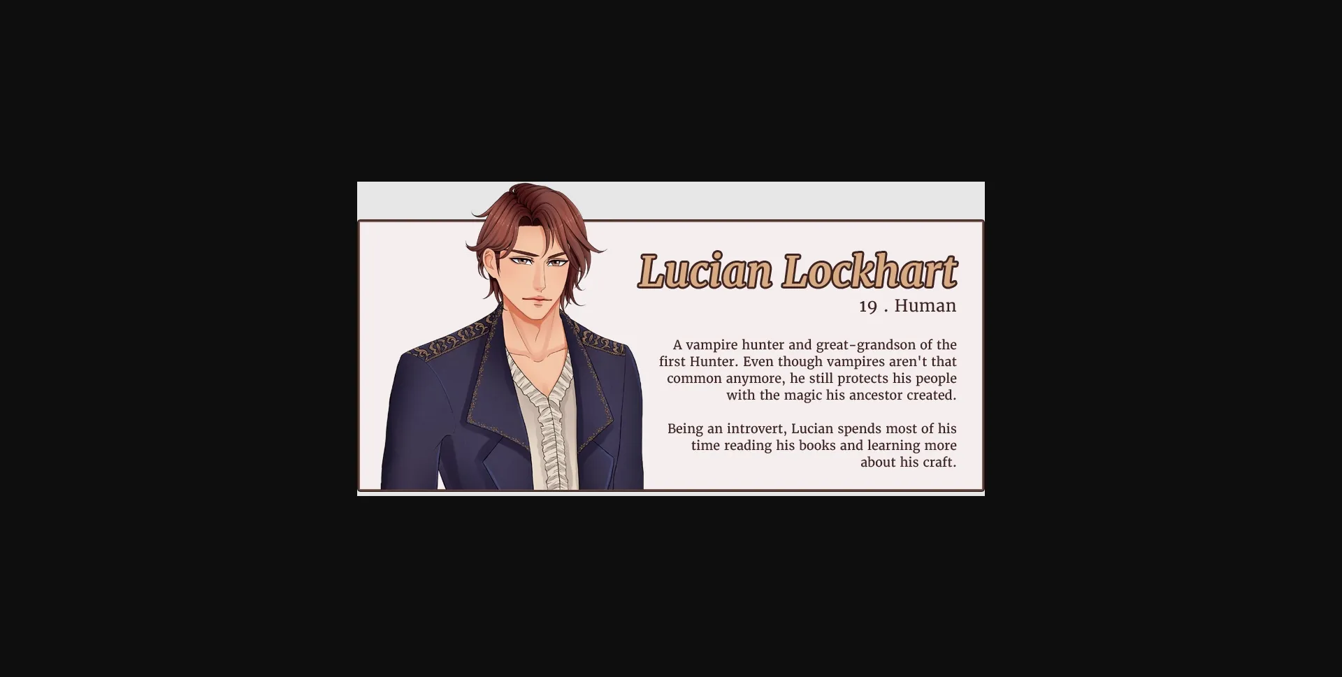 Being one of the youngest Vampire Hunters, Lucian Lockhart didn’t expect to encounter one of those bloodthirsty creatures in his lifetime. After all, vampires were on the brink of extinction and no one heard about a single apparition of them for more than fifteen years. However, the opportunity unexpectedly appears and Lucian finds himself face to face with the enemy he had only known from told stories and books. As if fighting a vampire for the first time wasn’t astounding enough, Lucian also discovers one thing about his family’s past that could tear apart everything he had believed to be true.