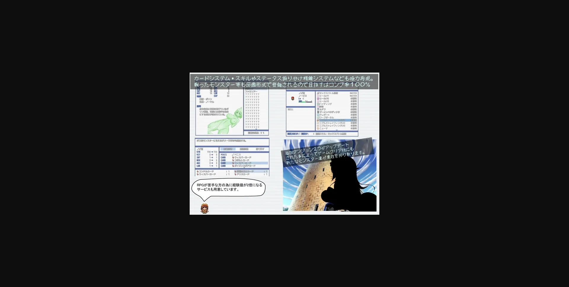 2D game, 2DCG, Adventure, Futa, Cumflation, Vaginal sex, Anal sex, Big tits, Beastiality, Fantasy, Male protagonist, Monster, Oral sex, Rape, Rpg, Turn based combat