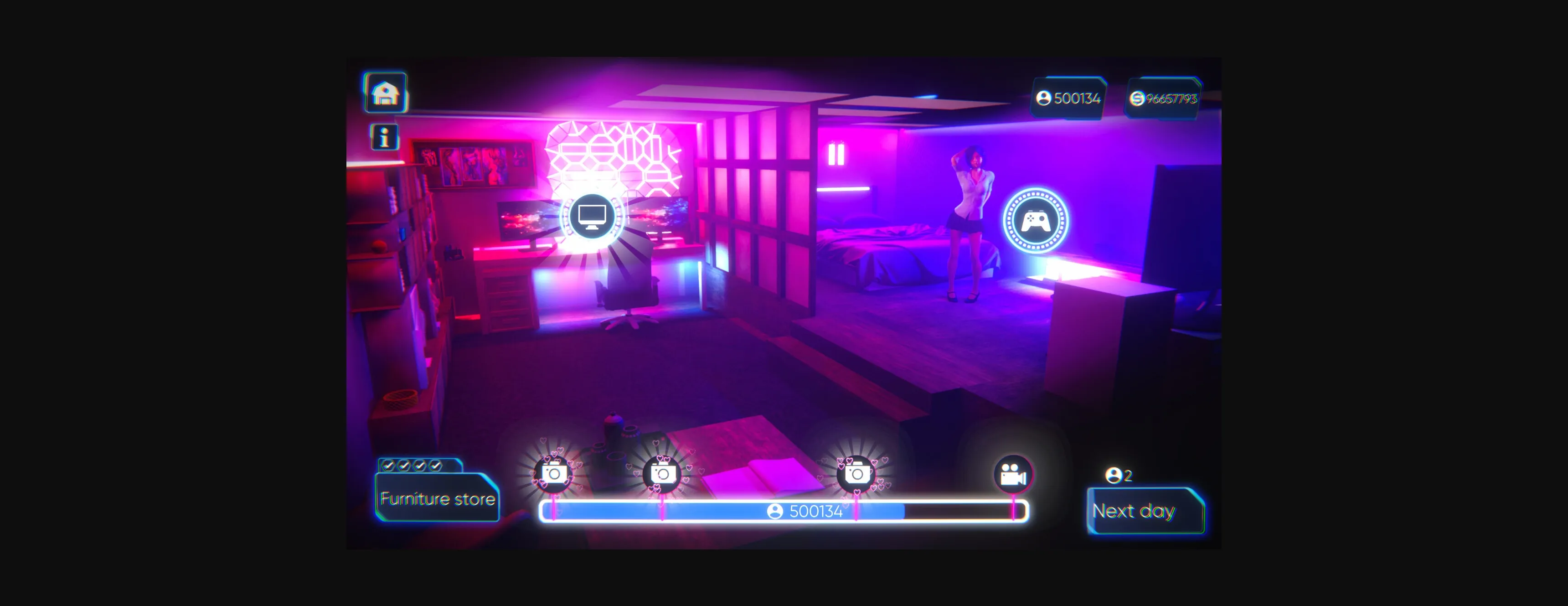 - Improve the Love Room with new equipments: TV, relaxation chair,… and unlock new sex spots.